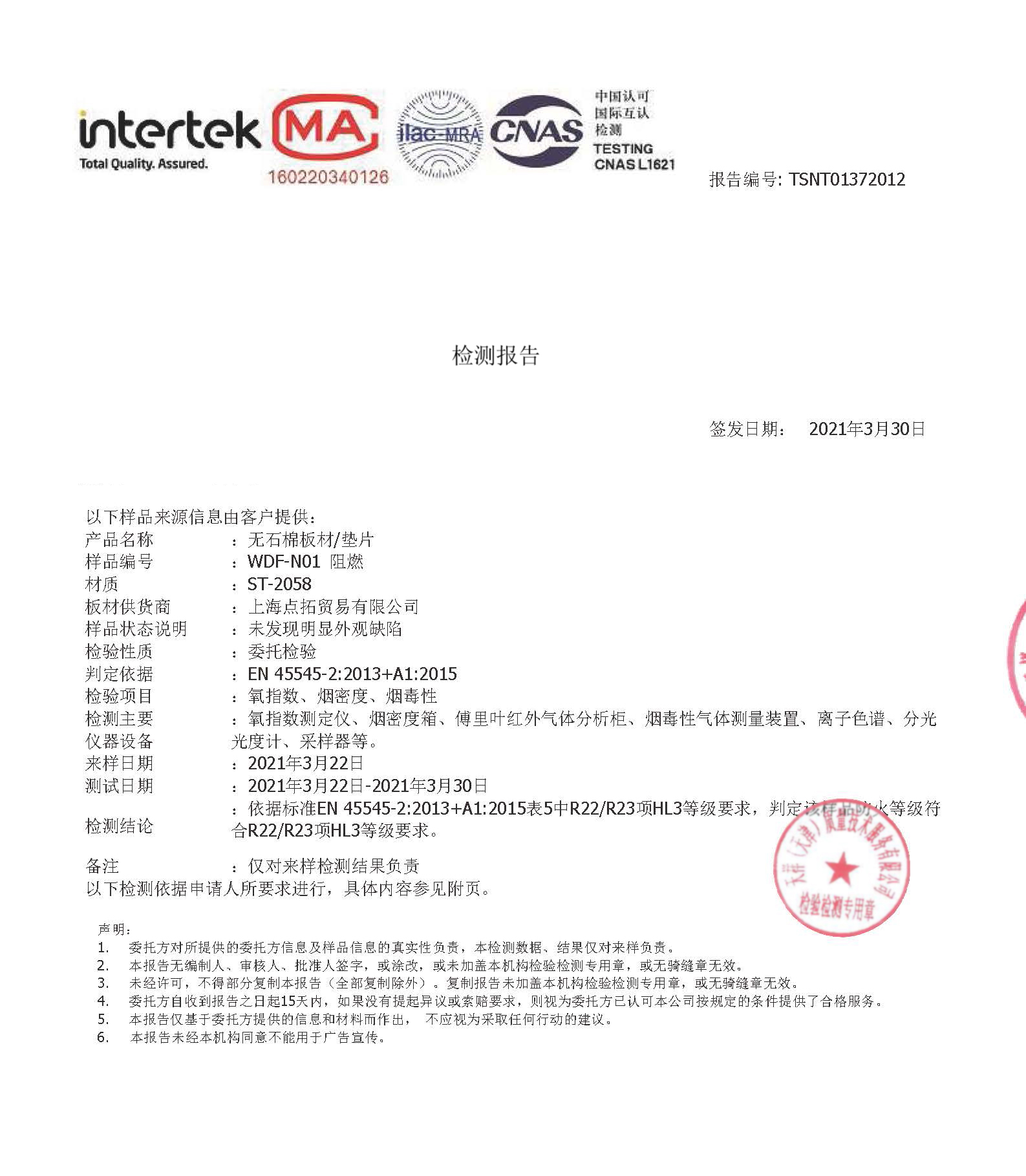 我司ST-2058無石棉板/墊片符合EN45545-2中R22/R23項HL3等級要求